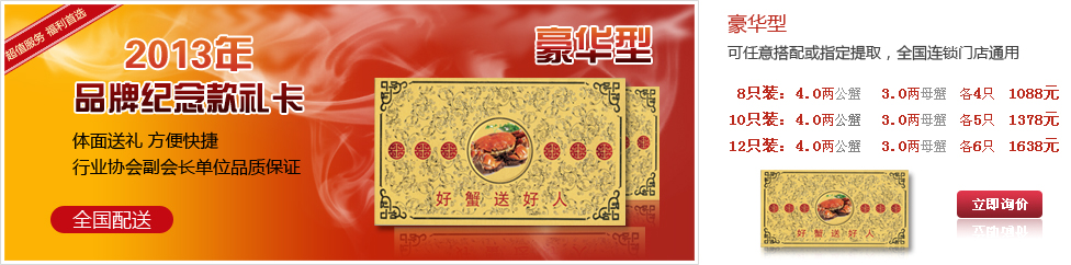 大閘蟹禮券是饋贈親朋好友、公司情意往來的好選擇,購買大閘蟹禮券也是輕松購買大閘蟹的方式。【查看詳情】
